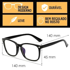 Proteja sua visão com estilo e modernidade usando os Óculos De Descanso Anti Luz Azul Sem Grau Anti Fadiga Visual. Esses óculos foram desenvolvidos para bloquear a luz artificial prejudicial emitida por monitores, TVs e celulares, evitando o cansaço, vermelhidão e dores de cabeça. Com lentes transparentes, os óculos anti luz azul blue ray blocker oferecem proteção eficaz comprovada, permitindo que você olhe por muitas horas para qualquer dispositivo que emita luz artificial sem agredir sua visão. Além disso, eles também auxiliam na regulação do sono, favorecendo a produção de e proporcionando um efeito anti-insônia. As características dos óculos incluem uma largura de 14 cm, altura das lentes de 4,5 cm, hastes de 14 cm e material em policarbonato. Eles são unissex e possuem lentes transparentes que oferecem proteção contra a luz azul e raios UV. Nossos óculos anti luz azul blue ray blocker são verdadeiros e feitos com matéria-prima de qualidade. Sua qualidade, acabamento e durabilidade são incomparáveis com itens similares da concorrência. Dúvidas frequentes: 1. Estes óculos anti luz azul possuem grau? R: Não, esses óculos não possuem grau algum. Eles são apenas equipados com filtro de luz azul. 2. Esses óculos ajudam a acabar com as dores de cabeça? R: Sim, caso as dores de cabeça sejam causadas pelo cansaço de olhar para fontes de luz artificial por muito tempo, esses óculos são recomendados. 3. Esses óculos são ? R: Sim, nós só trabalhamos com produtos , de qualidade, com procedência garantida e . Marca: Não Informado
