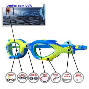 Os Óculos De Natação Gold Sports Little Fashion Fish High Definition 7,0 1. Foram projetado para proteger a saúde dos olhos: Estes óculos de natação são projetados especialmente para crianças que gostam de explorar o mundo com segurança debaixo d'água. Eles protegem a saúde ocular do cloro e água salgada frame em silicone gel ultra confort anti alérgico com excelente vedação. 2. Nossos Óculos de natação são projetados para tem um encaixe perfeito na cavidade ocular da criança, com frame em silicone gel ultra que impede a entrada de água. Eles não são apertados, mas confortáveis de usar 3. Tiras duplas livremente ajustável : A tira pode facilmente ser ajustada para caber e ajustar aperto da cabeça ba cabeça da criança, fazendo os óculos confortáveis e seguros. 4. Lentes clara :Óculos de natação, você pode desfrutar do mundo subaquático de relance. As lentes anti-embaciamento HD evitam que o vapor de água afete a sua visão, dando-lhe uma visão clara e transparente do cenário aquático. Suas lentes são em poli carbonato de ultima geração, com camada de proteção UVA e UVB e anti embaçante 5.Conforto: Feito de silicone macio e durável, os Óculos de natação não arranham a pele do rosto ou causam irritação. Eles também são fáceis de limpar. - Materiais: Silicone/poli carbonato - Características do produto: Tira ajustável lentes anti-fog em poli carbonato de alta definição possui camada protetora UVA UVB - Tamanho do produto: sobre 15cm/5.91in de comprimento - Marca: Gold Sports - Garantia: 30 dias após sua compra somente contra defeito de fabricação
