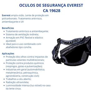 Óculos de Segurança Everest CA 19628 Proteção Ampla e Máximo Conforto Os Óculos de Segurança Everest foram desenvolvidos para oferecer ampla visão e máxima proteção ao usuário. Fabricados com lentes de policarbonato de 2,4 mm de espessura, contam com tratamentos antirrisco, antiembaçante e proteção UV. A armação em PVC flexível e o elástico ajustável garantem conforto e adaptação perfeita ao rosto. O sistema de ventilação indireta, com fendas na parte superior e inferior, assegura maior circulação de ar, reduzindo o embaçamento das lentes.