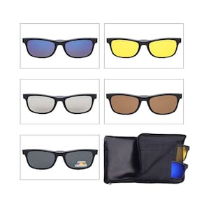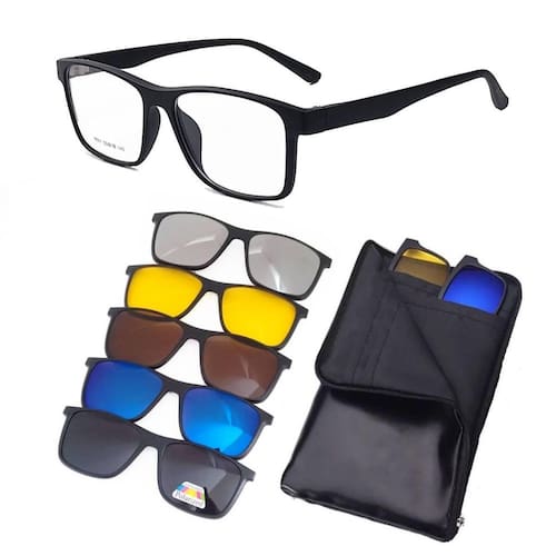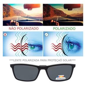 o conjunto de armação de óculos mais clip on é um modelo versátil podendo adicionar diferentes de lentes, moderno, sem perder o estilo, combina com qualquer formato de rosto e alem de ser resistente, leve e confortável. Lentes preto/cinza polarizado: as lentes polarizadas proporcionam uma visão mais nítida e confortável, garantindo proteção máxima contra os raios nocivos do sol uva/uvb 400nm , reduzindo o risco de desenvolvimento de doenças oculares e proporcionando o máximo de saúde para os seus olhos. Lentes amarelo visão noturna : as lentes amarelas são para uso noturno, pois elas reduzem os reflexos indesejados, aumentam a visibilidade e equilíbrio visual ao dirigir a noite contra luz de farol e/ou chuva, protegendo seus olhos com conforto e segurança, assim evitando possíveis acidentes. Lentes marrom: as lentes no tom marrom reduz o brilho sem escurecer a visão e são boas para ver com mais nitidez as cores e os contrastes. Lentes espelhadas: as lentes espelhadas tem um efeito que bloqueia a luz refletida em maior quantidade para garantir uma qualidade melhor de visão, e tambem ideal para uso no dia a dia na pratica de esportes e/ou uso casual. Confira as medidas na foto do anuncio
