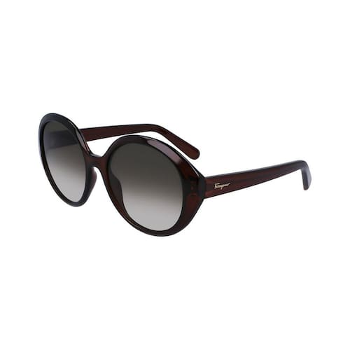 Óculos de sol Salvatore Ferragamo. Número da série: SF1067S. Código de cores: 210. Forma: Oval. Largura da lente: 57 mm. Ponte de lente: 18 mm. Comprimento do braço: 140 mm. 100% de proteção UV. Não polarizado. Material da moldura: plástico. Cor da moldura: marrom cristal. Tipo de lente: Gradiente cinza. Estilo do aro: aro inteiro. Código UPC/EAN: 886895558778. Óculos de sol femininos ovais de gradiente cinza Salvatore Ferragamo SF1067S 210 57.