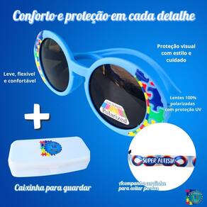 O grande destaque está nas lentes polarizadas com 100% de proteção contra os raios UV, que atuam diretamente na diminuição do impacto da luz solar e do reflexo nos olhos. Isso significa mais nitidez, menos cansaço visual e maior conforto para crianças com hipersensibilidade à luz, algo muito comum entre autistas. Com esses óculos, passeios ao ar livre, idas à escola, terapias ou qualquer atividade externa se tornam muito mais agradáveis e seguras.