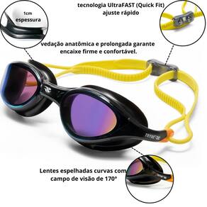 Desenvolvido para atletas de alto rendimento, triatletas e entusiastas da natação em mar aberto, o Óculos de Natação TRYON da Tryde oferece o equilíbrio ideal entre conforto, tecnologia e desempenho. Suas lentes espelhadas e curvas proporcionam ampla visão periférica de até 170°, perfeitas para longas distâncias e ambientes com alta luminosidade, reduzindo reflexos e protegendo os olhos contra os raios UV. A vedação anatômica e prolongada garante encaixe firme e confortável, adaptando-se a diferentes formatos de rosto sem permitir vazamentos. Fabricado com material resistente a impactos e equipado com tratamento antiembaçante (anti-fog), o TRYON mantém a visibilidade nítida mesmo após horas de uso. A tira dupla de silicone com fivela de ajuste rápido UltraFAST (Quick Fit) proporciona fixação segura e eficiente. O detalhe na cor verde facilita a identificação do nadador durante treinos e provas em mar agitado. Leve, robusto e com design hidrodinâmico, é o modelo ideal para quem busca performance com praticidade. Destaques do produto: