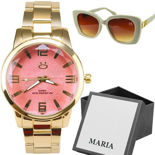 Oculos Sol Proteção Uv + Caixa + Relogio Feminino Banhado Conjunto Elegante Orizom Maria - Relógio Dourado, Óculos de Sol Premium e Caixa Exclusiva Surpreenda a Maria da sua vida com o Conjunto Elegante Orizom Maria, composto por um relógio de pulso feminino deslumbrante, um óculos de sol ultra premium e uma caixa exclusiva para o relógio. Este conjunto é mais do que um presente; é uma expressão de estilo e cuidado.