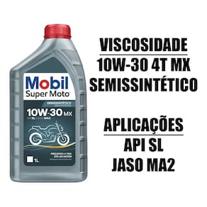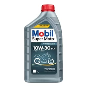 Mobil Super Moto 4T MX 10W-30 é um óleo semissintético com tecnologia avançada recomendado para motocicletas modernas de quatro tempos, para as quais as especificações do fabricante recomendam o uso de um óleo de motor SAE 10W-30. Formulado para oferecer o nível de proteção adequado para o motor, transmissão e embreagem, especialmente para os motores arrefecidos a ar, que tendem a operar em regimes térmicos mais elevados. Também é especialmente recomendado para motos 4 tempos equipadas com catalisadores para reduzir as emissões. É recomendado para as aplicações que requerem óleos API SL e atende aos requisitos de desempenho JASO MA2 (Certificação: M055CLE010)."