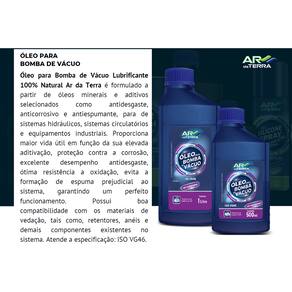 Óleo para Bomba de Vácuo Lubrificante 100% Natural Ar da Terra formulado a partir de óleos minerais e aditivos selecionados como antidesgaste, anticorrosivo e antiespumante, para de sistemas hidráulicos, sistemas circulatórios e equipamentos industriais. Proporciona maior vida útil em função da sua elevada aditivação, proteção contra a corrosão, excelente desempenho antidesgaste, ótima resistência a oxidação, evita a formação de espuma prejudicial ao sistema, garantindo um perfeito funcionamento. Possui boa compatibilidade com os materiais de vedação, tais como, retentores, anéis e demais componentes existentes no sistema. Atende a especificação: ISO VG46.