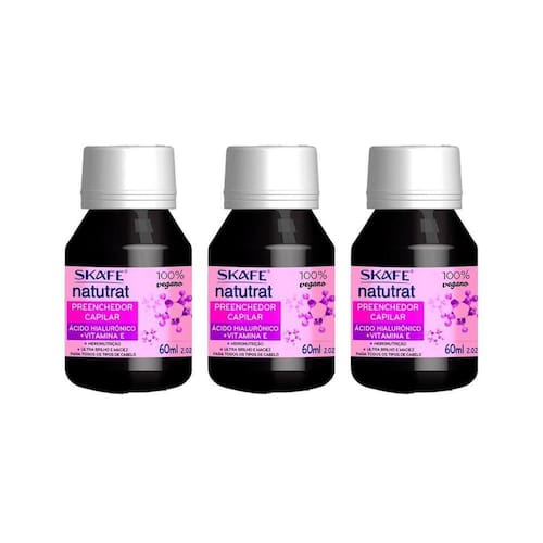 Descrição: O óleo capilar Skafe Natutrat com Ácido Hialurônico é um produto destinado ao cuidado e tratamento dos cabelos. Com uma embalagem de 60 ml, este óleo possui propriedades hidratantes e nutritivas que ajudam a promover a saúde e o brilho dos fios. O Ácido Hialurônico, conhecido por suas propriedades hidratantes, é adicionado à fórmula do óleo capilar para proporcionar uma hidratação intensa aos cabelos, ajudando a reter a umidade e evitando o ressecamento. Isso pode ser especialmente benéfico para cabelos secos, danificados ou quimicamente tratados. A aplicação regular do óleo capilar Skafe Natutrat com Ácido Hialurônico pode ajudar a melhorar a textura dos fios, deixando-os mais macios, sedosos e fáceis de pentear. Além disso, pode auxiliar na redução do frizz e na proteção contra agressões externas, como a poluição e o calor do secador e chapinha. Modo de usar: Lave bem o cabelo com shampoo e condicionador, como de costume. Com os cabelos ainda úmidos, aplique uma pequena quantidade do óleo capilar Skafe Natutrat na palma das mãos. Espalhe o óleo capilar entre as mãos e aplique-o ao longo do comprimento dos cabelos, evitando a raiz. Massageie suavemente para garantir que o óleo seja bem distribuído por todos os fios. Não é necessário enxaguar o cabelo após a aplicação do óleo capilar. O óleo capilar Skafe Natutrat pode ser utilizado tanto em cabelos secos quanto úmidos.