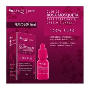 O Óleo de Rosa Mosqueta 100% Puro Max Love, não contém componentes adicionais, entregando assim, o máximo de benefíciosdo óleo, conhecido por auxiliar na prevenção de estrias, rugas e linhas de expressão. Seu poder hidratante é indicado para todos ostipos de pele, especialmente as mistas e secas. Pode ser utilizado no corpo, rosto, cabelo e unhas. 10ml