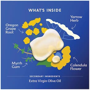 - Ingredientes limpos: azeite de oliva extra virgem, raiz de uva Oregon, goma de mirra, erva yarrow e flor de calêndula. Totalmente natural e orgânico. Nada mais.