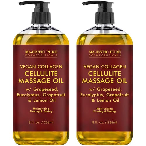 - Óleo de massagem Majestic Pure Cellulite, totalmente natural, sem substâncias químicas nocivas, com fórmula exclusiva de ÒD-Limoneneó; fabricado nos EUA