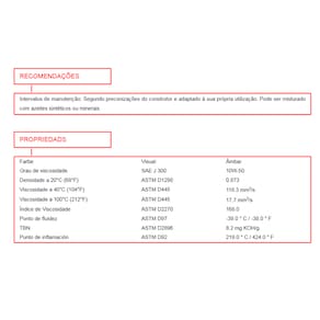 Loja Oficial Giro Moto Parts MOTUL 5100 é um lubrificante para motor de motos 4T que atende as demandas de confiabilidade para uso diário ou atividades recreativas.Adequado para qualquer tipo de motocicleta off-road ou de rua equipada com motor 4 tempos, com ou sem caixa de câmbio integrada, embreagem seca ou úmida.Perfeito para motocicletas com sistemas de pós-tratamento dos gases de escape, como conversores catalíticos ou injeção de ar secundária. Outras aplicações: Quadriciclos, UTVs e motos aquáticas, dependendo da recomendação de viscosidade do fabricante.Especificações:• Marca: Motul• Aplicação: Motor• Tipo de Motor: 4T• Tipo de Produto: 5100• Viscosidade: 10W-50• Normas API: API SP, JASO MA2 (2023)• 1 LitroConteúdo da Embalagem:01- Óleo Motul 5100 10W50