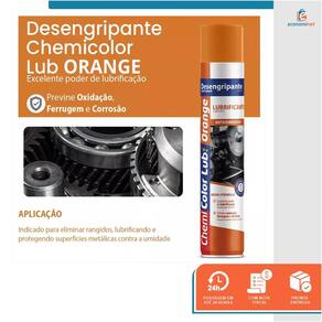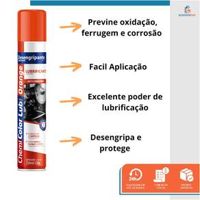 CARACTERÍSTICAS TÉCNICAS: Produto: Desengripante Modelo: Chemilub Benefícios: Alto poder de lubrificação e proteção contra a umidade, combate à ferrugem e engripamento, conforto lubrificação e proteção rigorosas. Aplicação: Elimina rangidos, lubrifica e protege superfícies contra umidade e corrosão. Conteúdo: 250ml / 120g Ref.: 3697452 Marca: Chemicolor