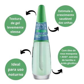 O Óleo em Gel Revitalizante Revita Nail é uma verdadeira revolução no cuidado das unhas. Com uma fórmula exclusiva e poderosa, oferece uma solução completa para quem busca unhas mais saudáveis, resistentes e bonitas. Possui textura de gel levemente oleosa, o que o torna ideal para uso noturno. Sua principal função é o estímulo ao crescimento saudável das unhas. Com óleo de rosa mosqueta + AHA* e extrato de bambu. Possui ácido glicólico. Hipoalergênico. Dermatologicamente testado. Vegano.