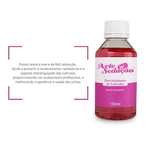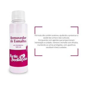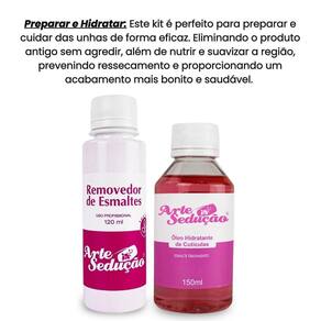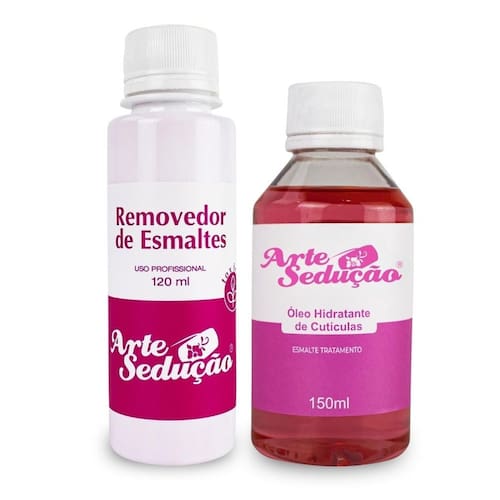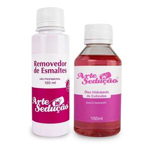 Contém: 01 - Removedor de Esmalte Sem Acetona, 120ml, Arte Sedução; 01 - Esmalte Óleo Hidratante de Cutículas, 150ml, Arte Sedução.