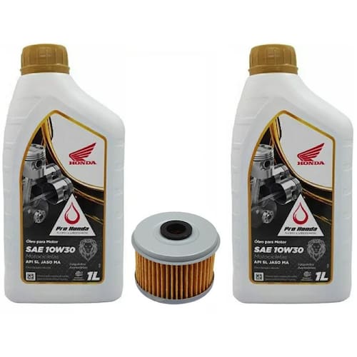 Óleo Honda 10W30 Filtro Óleo Honda Xre Cb 300 Cb 250 Twister Fotos ilustrativas Acompanha Marca/modelo/aplicação: conforme ficha técnica do anuncio Recomendamos a instalação em oficina mecânica especializada Itens inclusos: 02 litros de oleo genuino honda semi-sintético sae 10w30 + filtro de oleo honda hamp Uma evolução do óleo utilizado anteriormente nas motocicletas honda, o produto é um lubrificante semissintético, de especificação sae 10w-30 - api sj/jaso ma, indicado para motores quatro tempos de alta rotação, movidos a gasolina e/ou etanol álcool . Formulado com óleos selecionados e aditivos de alta tecnologia, possui características de alto desempenho e proporciona excelente proteção para o motor, transmissão e embreagem, melhorando a vida útil destes componentes, além de contribuir para redução do nível de emissão de poluentes ou mesmo o consumo de combustível. A partir de janeiro de 2011, todas as motocicletas honda já sairão de fábrica com o novo óleo genuíno. O manual do proprietário de todos os modelos da marca traz informações atualizadas sobre a especificação do produto e orientações de uso. Filtro de óleo honda hamp: 15412-hm5-a10 Aplicação: Cbx 250 twister todos os anos Cb twister todos os anos Xr 250 tornado todos os anos Cb 300 todos os anos Xre todos os anos Nx 400 falcon todos os anos Nx 350 sahara todos os anos Xlx 250/350 todos os anos Marca: Não Informado