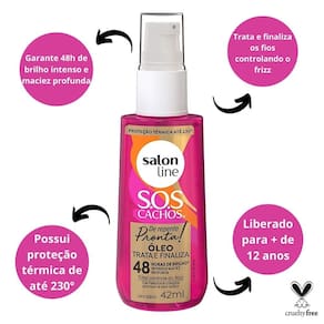 O Óleo Reparador De Repente Pronta! trata e finaliza os fios, garantindo 48h de brilho intenso e maciez profunda, além de total controle do frizz. Possui proteção térmica de até 230°. Para cabelos cacheados, crespos, porosos e sem brilho. Sem testes em animais. Para + de 12 anos.