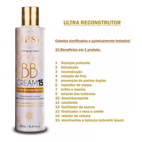 1 Nutrição profunda 2 hidratação 3 reconstrução 4 redução de frizz 5 prevenção de pontas duplas 6 repositor de massa 7 brilho e maciez 9 selante das cutículas 10 desembaraçante 11 emoliente 12 facilitador da escova 13 finalizador a seco e úmido 14 redutor de volume 15 movimentos e balanço natural Marca: Ps Cosmeticos