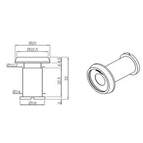 O Olho Mágico é composto de um visor de raio 2,5 cm com amplitude de visão de 200º e corpo em latão. É recomendado para utilização em portas com espessura entre 26 e 42 mm.