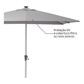 Com a manivela integrada, abrir e fechar o ombrelone se torna uma tarefa simples e sem esforço. E para iluminar suas noites ao ar livre, o ombrelone possui luzes de LED alimentadas por energia solar, proporcionando um ambiente aconchegante e convidativo.