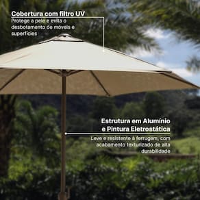 Com um design moderno e cores cuidadosamente selecionadas, a Linha Refúgio cria um ambiente acolhedor e elegante, onde família e amigos podem desfrutar de momentos inesquecíveis de descanso e relaxamento. Encontre seu refúgio perfeito e transforme seu espaço externo em um verdadeiro oásis de conforto e estilo. Acompanha Capa Protetora: Não Altura: 235 cm Altura Regulável: Não Ambiente Principal: Jardim e Varanda Comprimento: 23 cm Cor: Champanhe/Cinza Cor do Produto: Champanhe/Cinza Cor Predominante: Cinza Formato: Redondo Giratório: Sim Itens Inclusos: 1 Ombrelone Central, Base e Manual Largura: 270 cm Linha ou Coleção: Linha Refúgio Manual de Montagem e Instalação: https://cdn2.madeiramadeira.com.br/atributo/ampiezza/2309647-4760-1725910190457.pdf Material da Base: Alumínio Material da Cobertura: Poliéster Material da Haste: Alumínio Material das Varetas: Alumínio Necessita Montagem: Não Origem do Produto: Nacional Peso: 22,8 kg Possui Base: Sim Recomendações de Uso, Manutenção e Limpeza: Para limpar tecido Acqua Block, use água morna e sabão neutro. Esfregue suavemente com pano macio e enxágue. Evite produtos agressivos. Sistema de Acionamento Abre e Fecha: Manivela Suporte para Lâmpada: Não