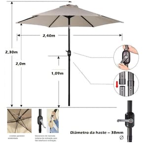( Fácil Operação ) O ombrelone facilita o uso. Basta girar a manivela para abrir o ombrelone. Caso deseja alterar a inclinação da cobertura é só pressionar o botão na articulação.