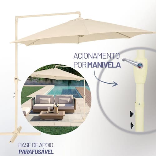 Cobertura: Poliéster Acompanha Base: Não Haste: 48 mm Acionamento Ombrelone: Manivela Dimensões Ombrelone: 300 cm x 300 cm x 245 cm Giratório: Sim Estrutura: Aço Cor: Branco Dimensões aproximadas montado (C x L x A): 168 cm x 28 cm x 13 cm Garantia do Fornecedor: 3 meses contra defeito de fabricação.