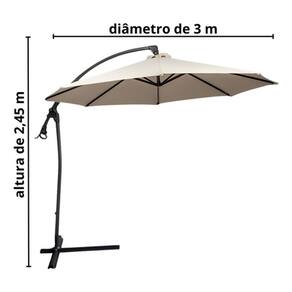 • Cobertura em poliéster • Cobertura de 3,00m de diâmetro / Altura 2,45m • Haste de diâmetro 48mm em alumínio com manivela • Varetas em ferro • Acompanha base de encaixe em formato de cruz