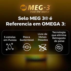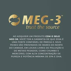 MEG-3 trust the source: Matéria-prima possui certificação de qualidade de pureza, isenção de contaminantes, metais pesados e oxidação. A elevada porcentagem EPA e DHA presente em sua composição, auxilia na manutenção do triglicerídeos em níveis saudáveis e possui ação anti-inflam.