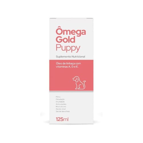 Omega Gold Puppy - 125 ml Ômega Gold Puppy é um produto específico para filhotes, alimento rico em ômega 3, ômega 6, ômega 9 e alguns ácidos graxos específicos, desenvolvido para complementar a nutrição dos animais em desenvolvimento. Vem enriquecido com Vitamina A, D e E, vitaminas essas que complementam ainda mais os benefícios desse excepcional produto. O Ômega Gold Puppy é de fácil aplicação e manuseio, além de um agrado mais que especial para o seu filhote.