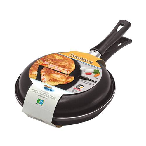 Omeleteira de Alumínio, revestida com antiaderente, formada por duas frigideiras que se encaixam, com cabos de baquelite resistentes ao calor. Ideal para o preparo de Omeletes, batatas rosti etc. Você vira o seu omelete ou o seu mexido de ovos, sem esforço e com segurança.