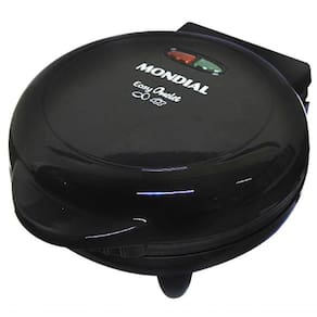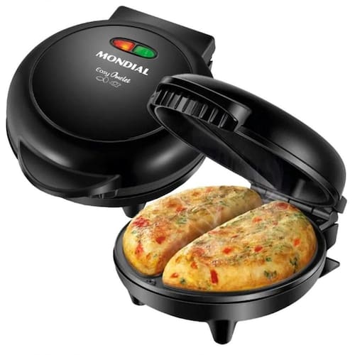 Omeleteira Mondial Luxx Black 220V com 750W de potência, prepara 2 omeletes simultaneamente, possui revestimento antiaderente, controle automático de temperatura e alça fria.Base antiderrapante