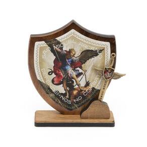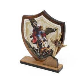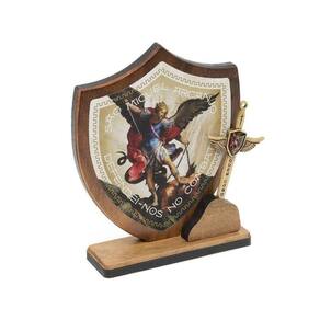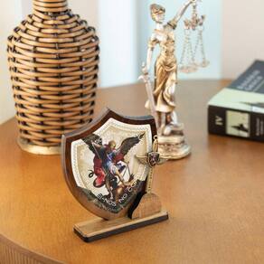 Oração de Mesa Madeira Escudo São Miguel. É no formato do escudo e acompanha espada de metal.