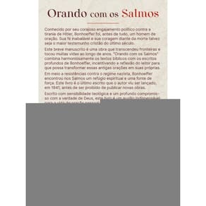Em 1945, o próprio Führer ordenou a execução do Pastor Bonhoeffer. Este desfecho da sua vida fez com que ele se tornasse conhecido por sua oposição ao nazismo. Poucos sabem, no entanto, que Dietrich Bonheffer foi um homem de oração. No livro Orando com os Salmos ele compartilha sua experiência de oração com o saltério, prestando um auxílio indispensável para a nossa vida de oração pessoal e comunitária. INCLUI UMA BREVE BIOGRAFIA de DIETRICH BONHOEFER Marca: ESPERANÇA *