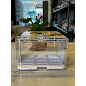 ORGANIZADOR CLEAR FRESH 2,2L NATURAL/ Descrição - O organizador de geladeira Clear Fresh com cesto duplo 2,2L promove frescor prolongado para os alimentos, para uma rotina mais saudável e sem desperdícios. O sistema de ventilação mantém o nível de umidade ideal para cada alimento. A armazenagem com cestos evita que as frutas, verduras e legumes fiquem molhados após a lavagem, aumentando a durabilidade dos alimentos. Sinta o frescor de uma vida leve, saudável e organizada. Sua transparência facilita a visualização dos alimentos e a organização do ambiente. Produzido em material resistente (PS Transparente), o organizador garante durabilidade, praticidade e fácil higienização. Transparência, beleza e cuidado com o alimento são características da linha Clear Fresh, perfeitas para auxiliar na organização da sua geladeira e facilitar o seu dia a dia."