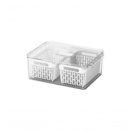 Descrição 1000 caracteres - O Organizador com 2 Cestos Dry 6,7 L é uma caixa organizadora transparente com tampa e cesto que serve para guardar mantimentos frescos na geladeira. É ideal para colocar frutas, legumes e verduras, deixando a comida fresca por mais tempo.Fabricado na cor transparente, com aspecto de vidro, este Organizador com Cestos conta com alças laterais. Suas dimensões têm 32,5 cm de comprimento, 22,5 cm de largura e 12,3 cm de altura.Multifuncional, os organizadores empilháveis de geladeira da linha Dry maximizam o espaço e são de polietileno tereftalato.Os cestos internos são na cor branco e possuem escorredor. A tampa tem respirador integrado e permite a circulação de ar. Fabricados com os mais rigorosos padrões técnicos e de segurança para você e sua família, os produtos da Coza são pensados para todas as necessidades, oferecendo o que há de mais tecnológico, moderno e elegante em cestas e caixas organizadoras.