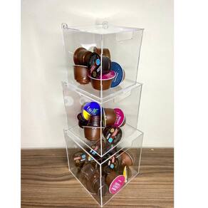 Com este conjunto, você terá 3 caixas de acrílico Cristal, cada uma com dimensões diferentes para acomodar diferentes quantidades de cápsulas. A caixa 1 possui dimensões de 11x11x11 cm, a caixa 2 mede 13x13x13 cm e a caixa 3 tem dimensões de 15x15x15 cm. Assim, você poderá armazenar e visualizar facilmente suas cápsulas, sem precisar abrir cada caixa para saber qual sabor está dentro.