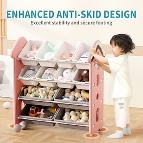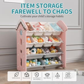 UNICOO Organizador de armazenamento de brinquedos infantis com design de casa de doces, rack de armazenamento de brinquedos infantil de 4 níveis com 12 compartimentos Especificação: Candy House Design fofo organizador de brinquedos infantis - Desenvolva habilidades de organização: o organizador de brinquedos para crianças da Unicoo's Candy House foi projetado com altura adequada para crianças para incentivar o acesso independente a livros, brinquedos e suprimentos. Sua aparência fofa e colorida não apenas melhora a decoração do quarto do seu filho, mas também promove suas habilidades de organização, levando a uma sala organizada. - Material seguro para crianças: feito de material HDPE de alta qualidade, nosso organizador é excepcionalmente durável, inodoro e livre de substâncias nocivas como BPA e ftalatos. Suas bordas elegantes e cantos arredondados são projetados para minimizar o risco de arranhões e batidas, priorizando a segurança do seu filho. - Estrutura estável e protetora: com uma estrutura triangular estável e suporte de força de quatro pontos equipado com almofadas de silicone antiderrapantes, nossa prateleira de armazenamento de brinquedos evita balançar ou tombar, enquanto também protege seu chão de arranhões. - Design moderno e elegante: exibindo um visual fofo e divertido, nosso organizador de brinquedos se encaixa perfeitamente em qualquer decoração de cômodo, tornando-o um ótimo complemento para quartos infantis, salas de jogos, salas de leitura ou berçários. Leve e fácil de mover, oferece flexibilidade de posicionamento. - Fácil de montar: as caixas de armazenamento são removíveis e leves, e todo o organizador é fácil de montar com todas as ferramentas necessárias incluídas. Construído com tubos de aço espessos, garante uma estrutura estável e antideformativa sob compressão. Montar com seus filhos pode ser uma atividade divertida que melhora suas habilidades práticas! - Dimensões das caixas de armazenamento: 38 x 25 x 20 cm para caixas maiores, 34 x 25 x 9 cm para caixas menores.