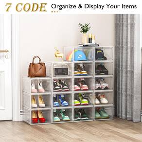 é fácil de instalar O armazenamento de sapatos é empilhável com estabilidade O armazenamento de sapatos é de plástico transparente O armazenamento de sapatos embalável é adequado para tênis - ? Imprescindível para todos os amantes de sapatos! - Os seis lados do organizador de sapatos são feitos de plástico sólido de alta espessura. Diga adeus às frágeis caixas plásticas de armazenamento de sapatos, nosso sólido organizador de armazenamento de sapatos que vale cada centavo.