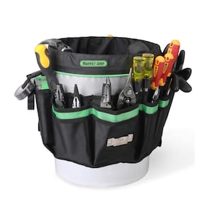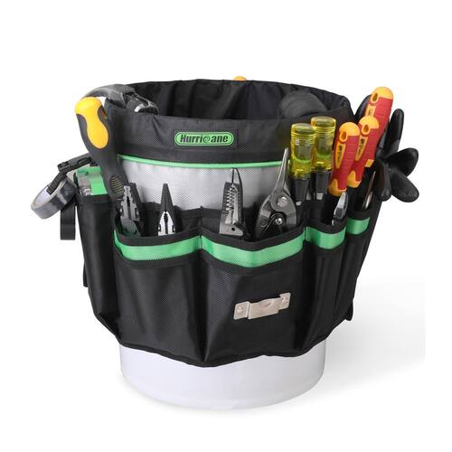 Mantenha suas ferramentas, equipamentos e equipamentos organizados e faça o trabalho mais rápido com nossas inovadoras plataformas, cintos de ferramentas e bolsas projetadas exclusivamente para empreiteiros, técnicos, trabalhadores manuais, eletricistas e muito mais. - Estrutura resistente: feita de poliéster 1680D resistente e resistente à água; esta bolsa de ferramentas é construída para durabilidade a longo prazo; o design dobrável permite armazenamento em massa dentro do seu balde; ferramentas e balde não estão incluídos - Alta compatibilidade: projetado para caber em baldes padrão de 5 galões; carregue suas ferramentas facilmente e rapidamente com este organizador de equipamentos leve e resistente - Armazenamento espaçoso: possui dez bolsos internos, quarenta e dois bolsos externos para organizar e transportar ferramentas; incluindo um laço de fita para rolos de fita e um clipe de barra de fita para fita métrica. (Ferramentas e balde não incluídos) - Vários usos: adequado para equipamentos de jardim; materiais de pintura; e qualquer outra coisa que sua imaginação permitir - Uma ótima ferramenta: é ideal para alguém que é trabalhador de construção, eletricista, faz-tudo, encanador ou gosta de trabalhar no jardim, etc