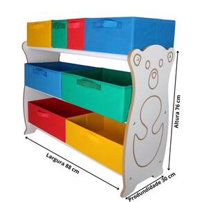A estrutura lateral em MDF branco conta com um lindo desenho de ursinho, que torna o móvel ainda mais atrativo para as crianças. As hastes de madeira revestidas em PVC garantem resistência, enquanto as caixas coloridas em vermelho, amarelo, azul, verde e amarelo trazem alegria e vivacidade ao espaço.