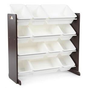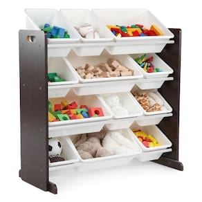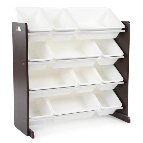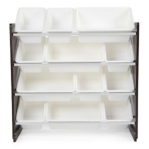 Tot Tutors - Organizador de Brinquedos - Dimensões: 86 cm L x 27 D x 78 cm A - Prateleira de madeira - cavilhas de suporte de aço - 12 caixas de plástico - Prateleira com acabamento de madeira branca