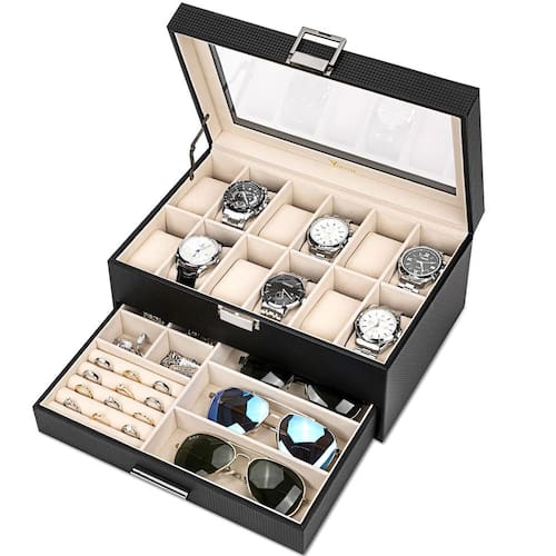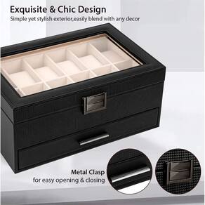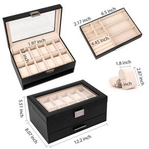 caixa de relógio - ?CAIXA DE JOIAS MULTIFUNCIONAL?: A caixa de joias é dividida em duas partes. A camada superior é uma caixa de relógio de almofada de veludo, que pode conter 12 relógios. A camada inferior é uma gaveta organizadora de joias que pode conter óculos de sol, joias, abotoaduras, elos sobressalentes, anéis, brincos, pulseiras e colares. Pode satisfazer todos os seus desejos. É um bom organizador de joias. - ?Armazenamento de alta qualidade?: o design da capa de vidro oco mantém seu relógio longe de poeira e oferece uma visão ampla. O organizador de joias pode ser completamente exibido do lado de fora quando amigos ou parentes visitam, você pode facilmente tirar qualquer coisa e fornecer armazenamento rapidamente. Todo visitante invejará o organizador do seu relógio. - ?Organizador de relógios multiusos?: você pode usá-lo em sua mesa. O estilo de design moderno será completamente integrado ao ambiente, o que é bonito e conveniente. você pode ficar tranquilo para entreter ao viajar. O estojo de joias de viagem resolverá o problema de perder joias para você e sua família, o tamanho perfeito pode atender a todas as suas necessidades. - ?Presente inesquecível?: o relógio é um símbolo de identidade. A caixa de relógio Voova também pode colocar joias, não se preocupará mais com muitas caixas de joias. Pode ser dado a amigos, pais, maridos, filhos e amantes. O presente perfeito para expositores de relógios, colecionadores e amantes individuais, por isso é uma caixa de presente de relógio para homens e mulheres. - ?Design perfeito?: 31 cm × 20,5 cm × 5,51 pol. / 31 cm × 20,5 cm × 14 cm. A superfície é feita de poliuretano, o interior é feito de madeira de alta densidade, tem um nome muito bom: caixa de joias antimanchas. A caixa de joias transparente é feita de plexiglass de alta permeabilidade, a parte inferior da caixa é anexada com um pano antiderrapante, que é antiderrapante e não frágil. Há um defletor móvel na caixa de joias da gaveta, você pode ajustar o tamanho.
