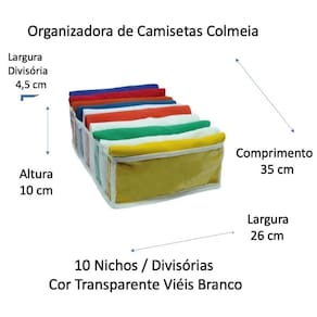 Para que serve Este organizador serve para armazenar e organizar diversos itens como, por exemplo: - Para organizar camisetas, jaqueta infantil, bermuda de malha, moletom infantil, pijama infantil, biquinis sem bojo, leggings, toalha de mesa e rosto dentre outros; - Perfeito para armazenar Camisetas Femininas e Masculinas Esse prático kit possu 2 organizadores colmeias com 10 dez nichos cada, divisórias, para facilitar a organização de gavetas e do armário. Confeccionada em plástico transparente, ela facilita a visualização das peças para que suas peças fiquem sempre protegidas. Otimize seu espaço e guarde as peças em um mesmo lugar, que podem ser levadas inclusive em viagens. Marca: Não Informado