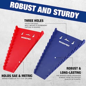 WORKPRO Pacote com 4 organizadores de chaves magnéticas, conjunto de 12 peças para caixa de ferramentas, caixa de ferramentas, porta-chaves de qualidade premium SAE (1/10.2 cm - 15/40.6 cm) e métrico (6 mm-24 mm) - Grande capacidade: o organizador de chaves de ferramentas é projetado especificamente para armazenamento de chave. Cada cabide comporta 12 chaves, permitindo que quatro peças armazenem um total de 48 chaves. Observação: as chaves não estão incluídas - Ajuste universal para SAE e métrica: cada suporte de chave magnética acomoda chaves SAE (de 1/4 a 15/40.6 cm) e chaves métricas (de 6 mm a 24 mm). Oferece espaço de armazenamento generoso para todo o seu conjunto de chaves inglesas - Construção de qualidade: Feita de plástico de alta qualidade, esta bandeja de chave promete durabilidade e confiabilidade. É fácil de configurar e usar, o que a torna a escolha ideal para qualquer oficina - Fixação magnética segura: ímãs poderosos de terras raras mantêm o suporte de chaves estável, seja dentro de uma gaveta ou preso à lateral de um baú de ferramentas. Os ímãs também garantem que o organizador permaneça no lugar quando a caixa de ferramentas for realocada ou a gaveta estiver fechada - Organização eficiente: este organizador de chaves magnéticas garante que você sempre tenha a chave certa à mão. É ideal para caixa de ferramentas ou montagem na parede. Além disso, use as cores vermelha e azul para diferenciar entre chaves métricas e SAE ou vários tipos de chave inglesa