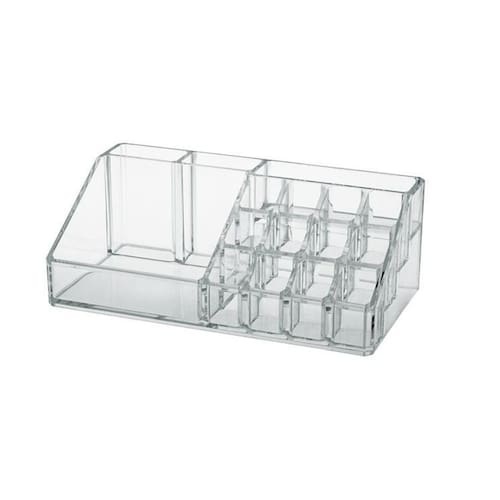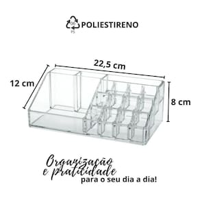 O organizador de maquiagem mais completo que você pode encontrar Nele você poderá armazenar batons, lápis, pinceis, bases, cremes etc em mais de 10 divisórias. É um produto prático e compacto, pois tudo isso poderá ser guardando em um espaço de 22,5 x 12 cm, seja no guarda roupa, gaveta, escrivaninha penteadeira, quarto ou bainheiro. Produzido em poliestireno, material nobre e , de alta resistência durabilidade e qualidade.