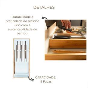 O Organizador De Facas 9 Divisórias Gavetas Cozinha Keep Bambu é feito com bambu, um material 100% renovável, que traz sofisticação para a decoração da sua casa. Seu design modular permite uma harmonia completa com o ambiente, enquanto suas 9 divisórias garantem que suas facas sejam acomodadas de forma segura, preservando o fio e evitando acidentes. Produzido com plástico PP de alta resistência, o organizador oferece durabilidade e praticidade. Além de trazer organização para a sua cozinha, o organizador de facas da Keep possui um design moderno, economiza espaço e oferece praticidade no dia a dia. A marca Keep é conhecida pela qualidade e durabilidade dos seus produtos. Compre agora o Organizador De Facas 9 Divisórias Gavetas Cozinha Keep Bambu e eleve o nível da organização da sua cozinha. Marca: Não Informado