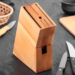 Transforme a organização das suas facas em um detalhe de puro requinte e funcionalidade! Combinando um design minimalista com a beleza natural do bambu, este conjunto não é apenas um utensílio, mas uma peça de decoração que eleva o nível do seu ambiente. -Feito para faca de cozinha, cutelo, faca de frutas, chaira, tesouras, etc. -O design vertical economiza espaço, mantendo suas facas organizadas de forma segura e visível. -O suporte em bambu possui slots específicos que acomodam as facas de forma segura, protegendo o fio e evitando acidentes. Especificações Técnicas: - Material: Bambu - Dimensões Aprox.: 22,8cm (ALTURA) x 8,8cm (LARGURA) x 15,7cm (PROFUNDIDADE) - Base antiderrapante - 7 entradas Itens Inclusos: - 01x Porta facas