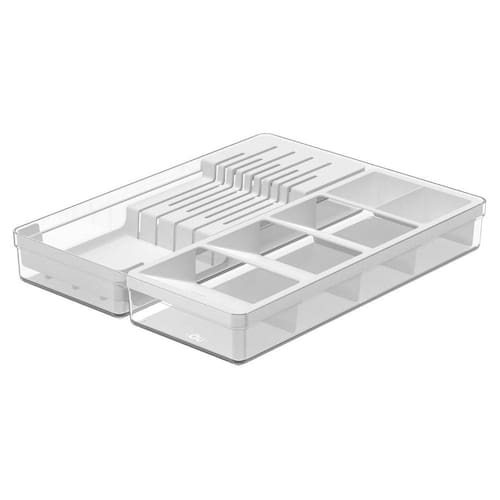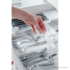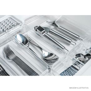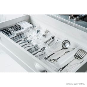 A Linha Clear é a união entre transparência e organização que independente do ambiente, promove um design perfeito para organizar e aumentar o espaço das suas gavetas.O Organizador de Facas e Talheres Clear 37,5x30x5,6 cm Branco OU foi pensado para permitir diversas composições e proporcionar máximo aproveitamento de espaço nas gavetas, por isso, traz 5 opções de organização e ícones indicando a setorização dos talheres, além de espaço para a organização de utensílios. Combine, encaixe e enxergue facilmente o conteúdo, mantendo tudo em ordem.Produzido em material resistente que proporciona alta transparência, fácil higienização e praticidade na hora de organizar. A linha clear é indispensável para auxiliar você na organização da sua casa.Código de Barras:7908466018245 Referência:OGC2100BCF Marca: OU Composição/Material: Poliestireno Dimensões aproximadas do produto (cm):5,6x30x37,5 cm Peso aproximado do produto (kg):0.716 kg