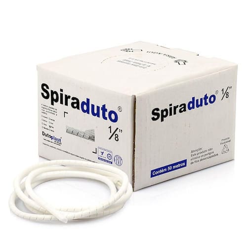 Organizador De Fios E Cabos Spiraduto 1/8 Branco - 10 Mt Proteja e organize seus cabos com facilidade usando o Spiraduto de 1/8. Além de proteger, ele possibilita a saída do cabeamento em qualquer ponto do chicote. Ele permite várias composições de layout e uma isolação mais segura ao seu sistema de cabeamento.