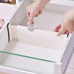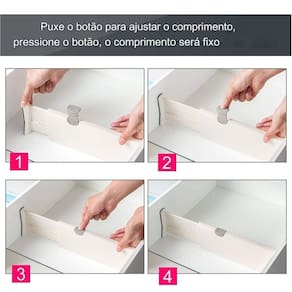 É muito fácil de usar, basta puxar a aba cinza para cima, em segundo lugar, estenda a divisoria para caber na sua gaveta. Por fim, empurre a aba cinza de volta para baixo para travar no lugar.